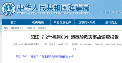 5月31日,中华人民共和国海事局在官网发布了《阳江“7·2”“福景001”起重船风灾事故调查报告》。该报告共57页,包含: